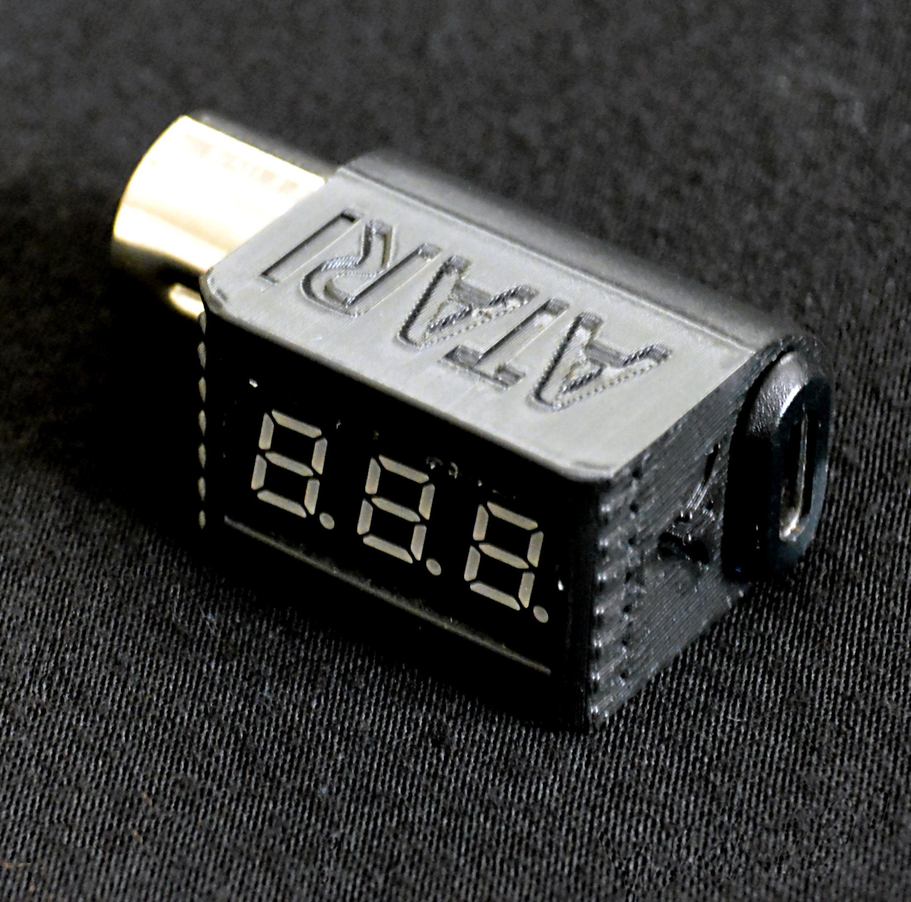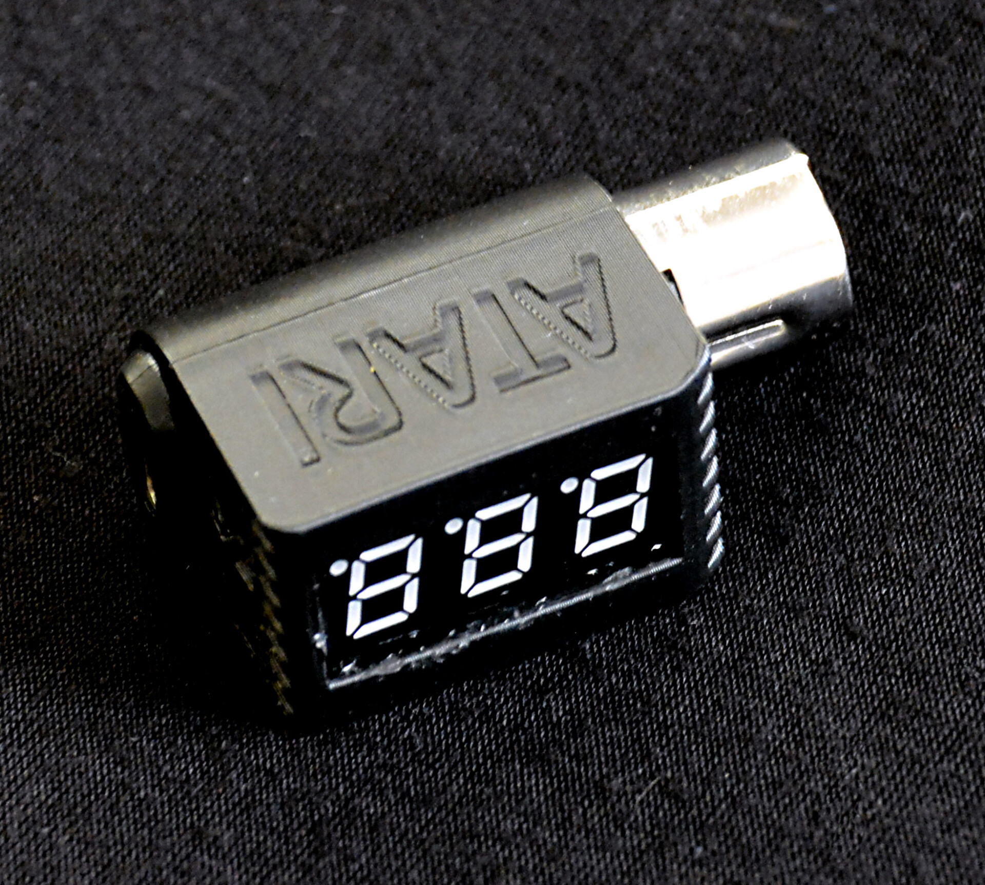 The case is 3D printed in black with Atari signage around, it can be connected to any phone charger or USB outlet that provides 5V 2 Amps.