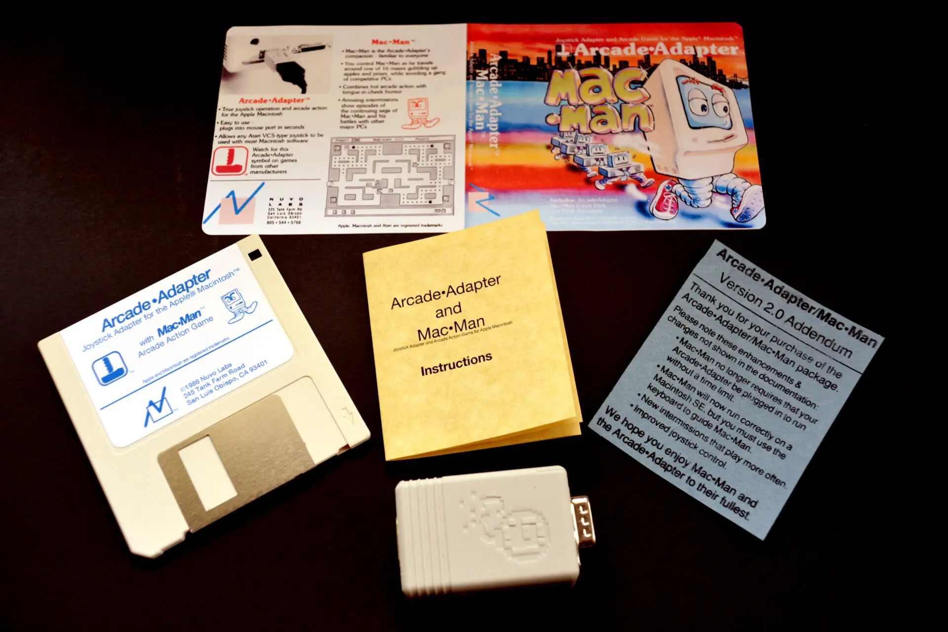 Mac-Man is the companion to the Arcade Adapter. Patterned after familiar arcade action games, Mac-Man is the first game on the Mac to be able to take advantage of the true joystick operation provided by the Arcade Adapter. It’s certain to provide many hours of fun and relaxation any time you feel that you’re taking your Macintosh too seriously. Mac-Man requires a Macintosh 512K or Macintosh Plus computer.